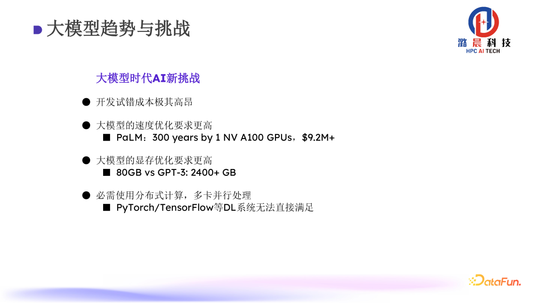 我们不仅需要更多的资源去部署,而且需要更大的精力才能完成训练。所以必须采用大规模分布式训练系统才能完成训练需求,这就对系统部署产生了新的挑战。