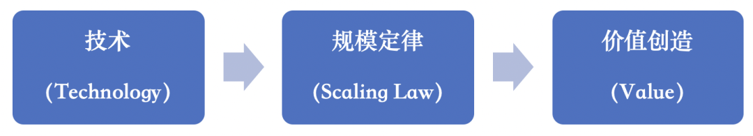 Altman是在说,有三个规律加在一起,定义了AI技术如何改变经济和商业:首先,在技术能力上,对AI技术的投入力度决定了AI能力。其次,在应用迭代速度上,AI能力和需求形成良性互动的飞轮,体现在快速下降的成本和需求体验,可以用“规模定律”(Scaling Law,过去大半个世纪的规模定律是摩尔定律)来衡量。最后,因为AI是通用技术,所带来的经济和商业价值会指数级增长。