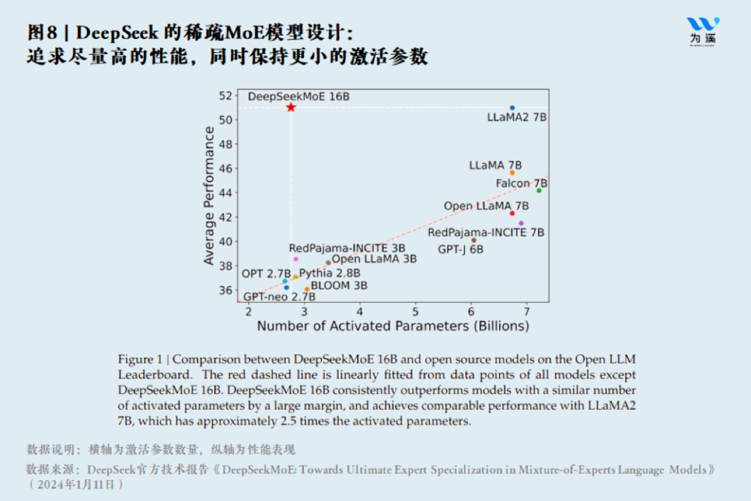 ① 更少的内存占用,主要有两个实现手段:一是 MLA(Multi-head Latent Attention,多头潜在注意力机制),二是 FP8 混合精度训练。前者可以理解为在计算时把一个巨大矩阵可以分拆成两个矩阵的乘积,其中一个矩阵在训练完成后冻住,用小的矩阵做推理,对整个计算量的要求是指数级的降低;后者可以理解为“精打细算”,在精度要求不高的地方使用 FP8,在精度要求高的计算力使用 FP16 或者 FP32(数字越大表示精度越高)。