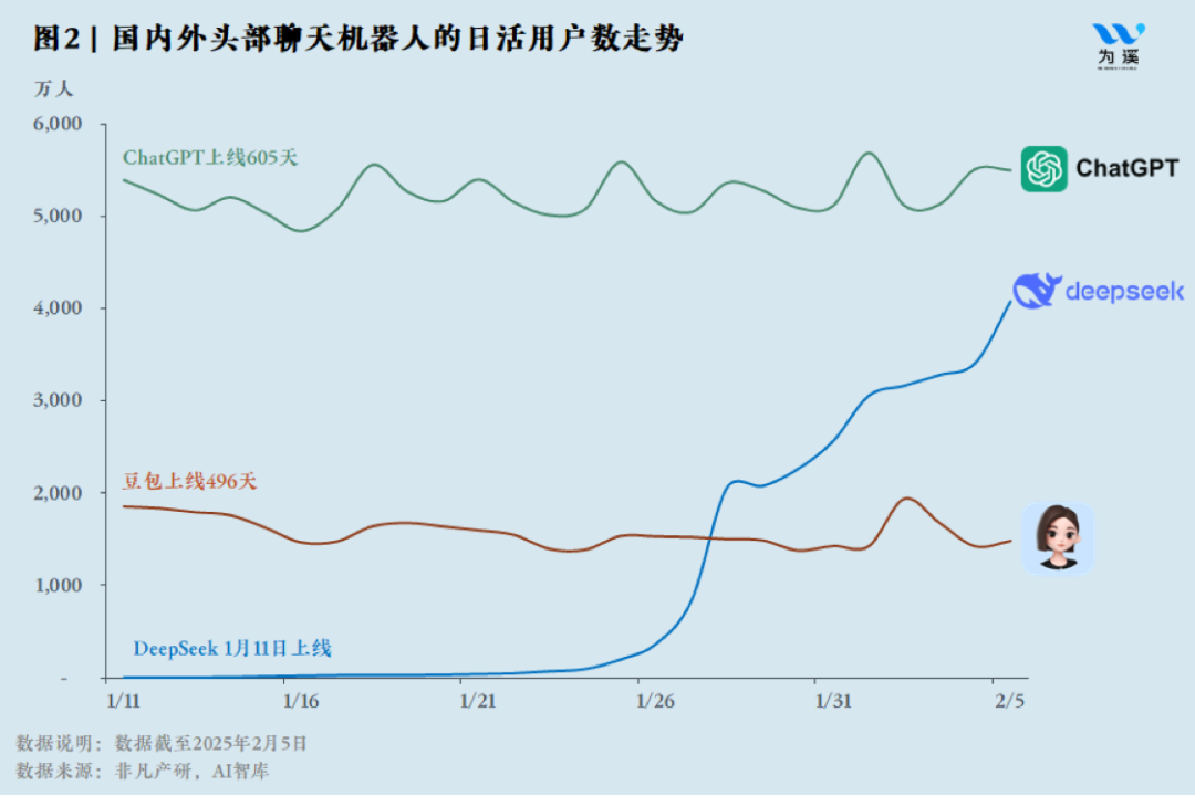 截至 2025 年1月31日,DeepSeek的日活已突破 2215 万,仅仅用了一个多星期,已超过豆包一年的努力(1695 万日活),并达到ChatGPT日活的40%(5323 万,见图2);到2月5日,DeepSeek日活突破4083万,是豆包日活的2.75倍,ChatGPT日活约75%。可以预见,DeepSeek会很快超过ChatGPT,成为世界上日活最高的大模型。