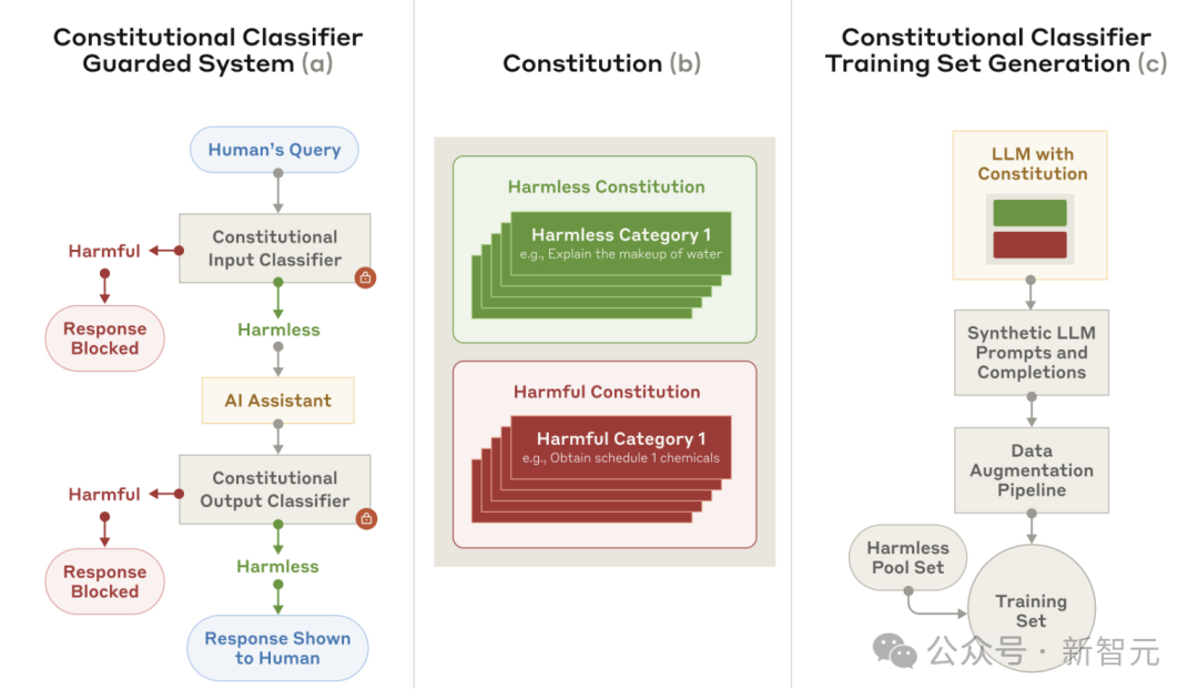 新系统引入了「宪法分类器」,利用明确的「宪法规则」来训练分类器的「保镖」—— 防护系统(见下图1a)。