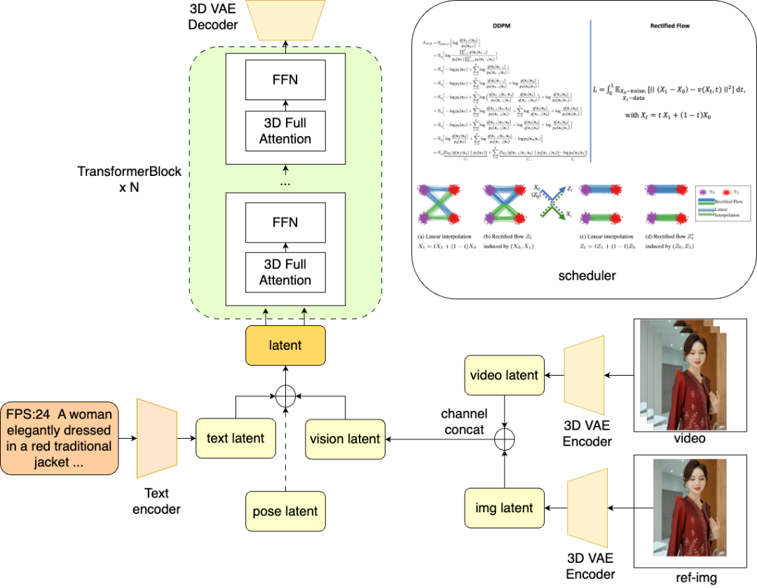 丰富的衍生模型能力:“淘宝法象”不仅仅是图生视频!我们构建了一系列视频生成和编辑模型矩阵,包含:视频换衣模型,视频换背景模型,视频生视频模型,视频延展模型,动作驱动图生视频模型,语音驱动图生视频模型,虚拟人驱动模型等等。各项算法能力有层层递进、相互促进的关系,同时可组合出支持不同控制条件的产品级能力,支持多样的应用场景和业务需求,具体效果和应用场景见本文第二部分。