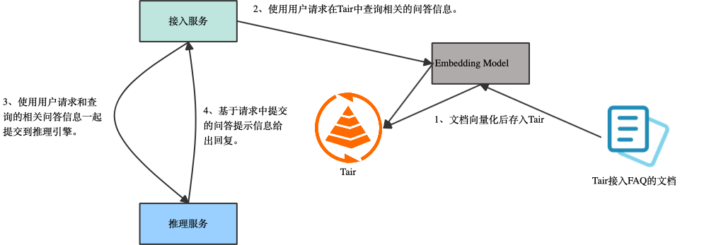 使用RAG(Retrieval-Augmented Generation,检索增强生成)能够有效解决传统大型语言模型(LLM)在实际应用中的局限性,包括:相比于Fine-tuning(微调),RAG 可以有更低的成本和更高的数据时效性。Tair 向量引擎是Tair自研的扩展数据结构,提供高性能、实时,集存储、检索于一体的向量数据库服务。支持HNSW 算法和暴力搜索,具备横向扩容和分布式全局索引的能力。能够解决 RAG 中数据索引的问题。例如需要实现一个 Tair 接入 FAQ 的问答机器人,可以采用如下方案。