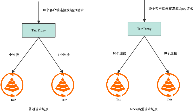 消息队列最关键的问题是如何保存数据的持久化,保证消息至少被消费一次。社区 Redis aof 采用异步落盘方案,宕机时可能丢失部分数据。Redis 主备间也采用异步同步,HA 切换时可能丢失部分数据,所以无法保证消息至少被消费一次。社区 Kafka 通过配置producer.type来控制刷磁盘方式,有sync和async方式,sync 模式会对性能有一定影响,async方式会丢失 pagecache 中还没刷盘的数据。Kafka 通过配置 request.required.acks 来控制消息的生产,acks 的默认值为 1,即主备间为异步同步,HA 切换时可能丢失数据。所以 Kafka 通过修改默认配置可以保证消息至少被消费一次,但吞吐会下降,延时会上升,实测高负载下 acks = -1 采用全同步模式会让延时提升数倍。Tair 有多种存储引擎,其中持久内存版使用非易失性内存,数据写入即完成持久化,确保宕机时数据不丢失。同时 Tair 支持半同步功能,开启该功能对读请求没有影响,写请求会保证 log 同步到备节点再返回,写请求的 RT 会上升,但平均 RT 能保持亚毫秒级,并且通过多线程框架,实例吞吐不会下降。Tair 在消息队列上的优化可以参考之前的文章《Redis消息队列发展历程》。目前推理服务的规模都很大,通常使用 Tair 128-256 分片的集群,客户端发起大量的 block 类型请求导致 Tair 集群的连接数非常多,大量的连接导致内存消耗高,同时大分片集群的流量也很高。大量的连接、高内存占用、高带宽给 Tair 带来了挑战。当客户端发起普通请求时,无论客户端到 proxy 有多少连接,proxy 都能进行连接聚合,使 proxy 到每个 db 的连接数为一个固定的常数。而当客户端使用 block 类型请求时,proxy 到 db 的连接无法聚合,proxy 会为该客户端连接创建一批私有连接(private 连接),此时如果客户端每个连接都随机访问所有 key,则最终客户端到 proxy 有多少连接,proxy 到每个 db 就会有多少连接。因为这个机制导致 db 上连接数超限,而且该连接模型下通过横向扩容也无法降低每个 db 上的连接数。只能用户侧做改造,降低客户端连接数,或将客户端连接分组,一组连接只访问部分 slot。