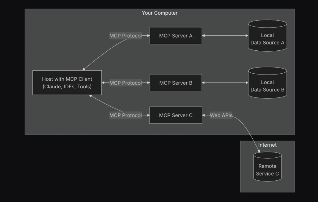 - MCP 服务器:它托管了提供对数据源、API 或工具链访问的端点,同时管理身份验证和速率限制,以确保对功能的安全和受控访问。