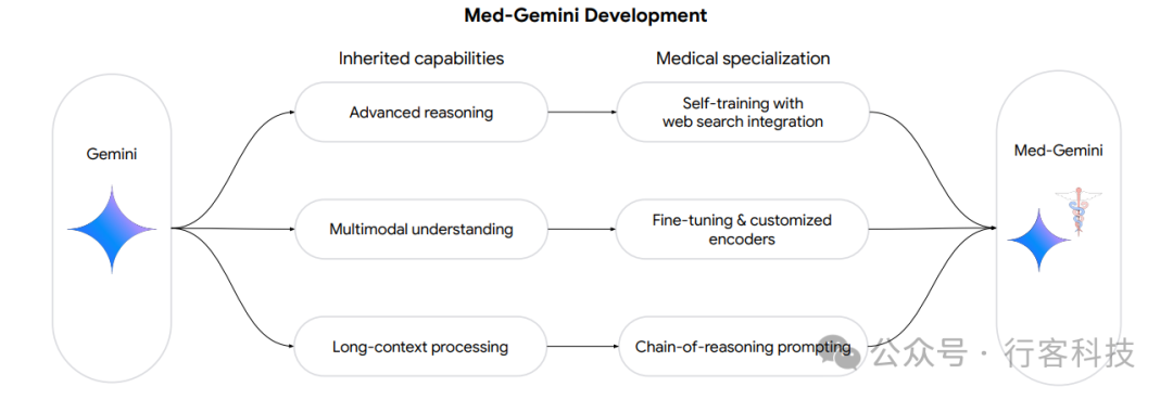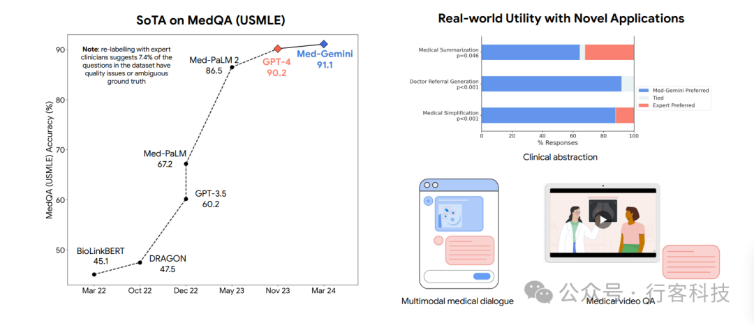 【行客按】Med-Gemini模型是基于Gemini模型系列的高级AI工具,专门针对医学领域进行了优化。该模型整合了网络搜索功能,并可通过自定义编码器针对新型医疗内容进行调整。在14个医疗基准测试中,Med-Gemini在10个中达到或超越了行业最高标准,特别是在MedQA基准测试中,通过引入不确定性引导的搜索策略,实现了91.1%的高精度,较之前的Med-PaLM 2模型提升了4.6%。在实际应用中,Med-Gemini不仅在生成医学文本总结和转介信方面超越了人类专家,还在多模态医学对话和医学研究领域显示出巨大潜力。