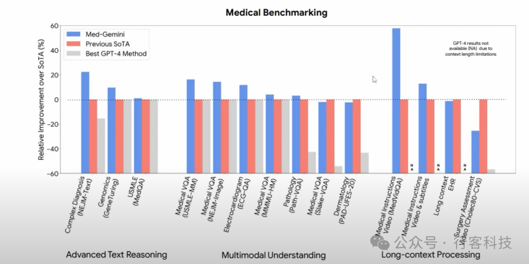 在多个医学基准测试中,Med-Gemini相比GPT-4显示出更加优越的性能。这不仅因为其深度学习能力,还包括其在特定医疗任务中的专业调整,如增强的推理能力和改进的模态集成方式。这使得Med-Gemini在模拟医学考试(如USMLE)等场景中,能够提供更为准确和实用的答案。