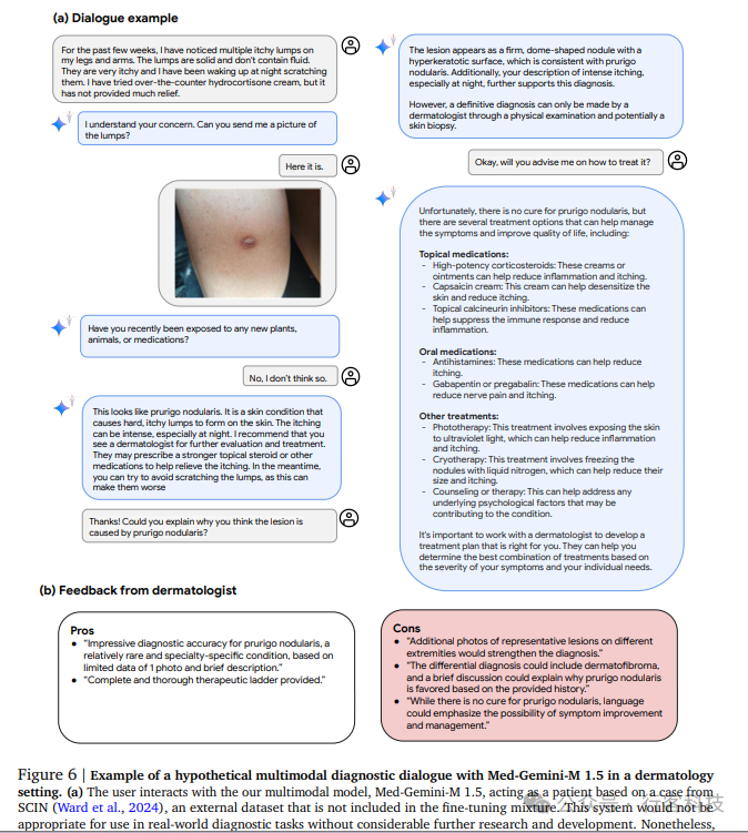 图 6: 皮肤科场景下与 Med-Gemini-M 1.5 进行假设性多模态诊断对话的示例