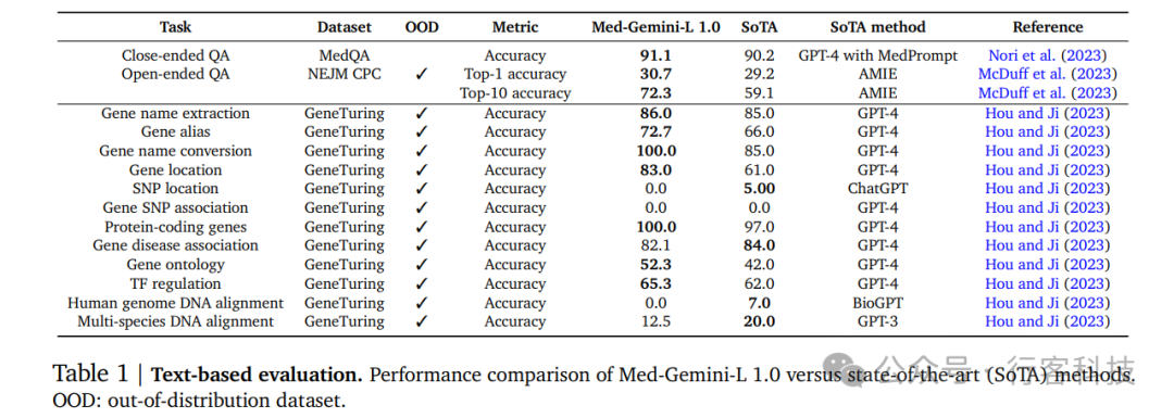 此外,在新英格兰医学杂志(NEJM)发布的CPC复杂诊断挑战中,Med-Gemini-L 1.0以13.2%的优势超越了先前的行业标准AMIE模型,该模型本身已优于GPT-4。这一成就在图3a中有所展示。该搜索策略同样适用于基因组学知识任务,如表1所示。在七个GeneTuring模块中,Med-Gemini-L 1.0的表现优于Hou和Ji在2023年报告的其他顶尖模型。