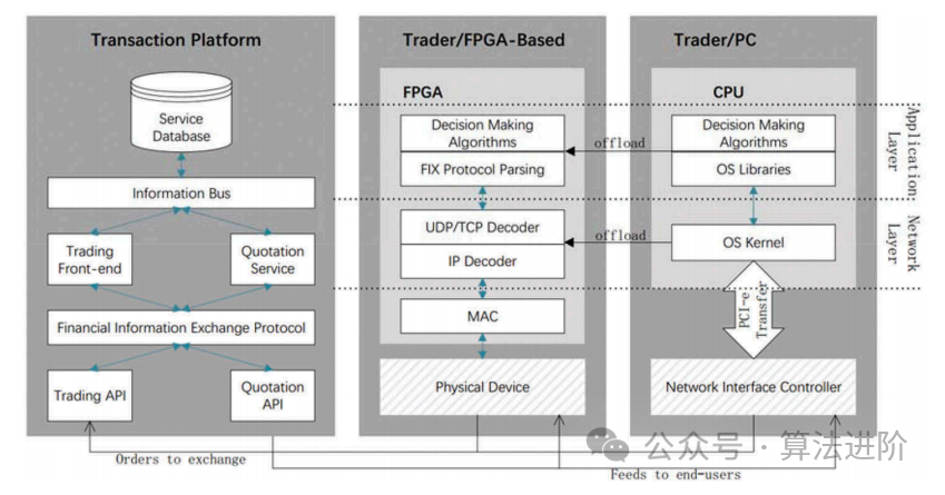 图2 交易所交易平台(左)、基于 FPGA 的交易系统(中)和未优化的 PC 交易系统(右)。将应用层和网络层从CPU卸载到FPGA将大大减少延迟。