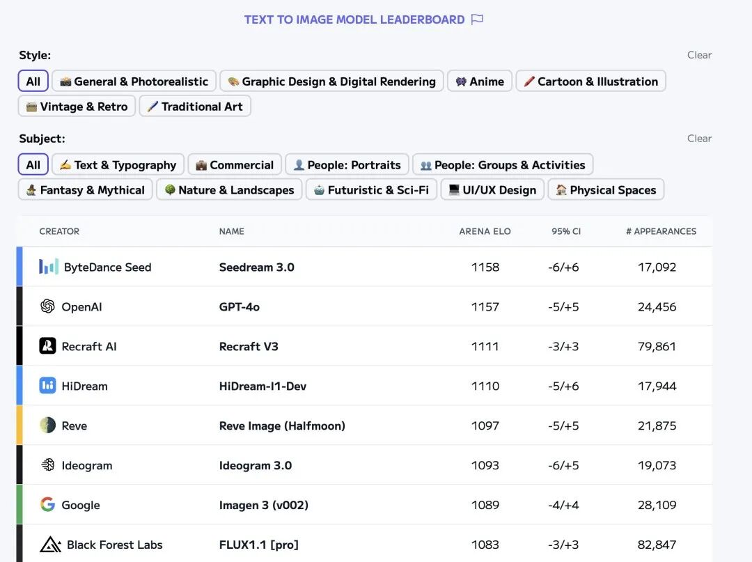 Seedream 3.0 的研发始于 2024 年末,通过调研设计师等群体的实际需求,Seedream 团队不仅将图文匹配、结构、美感等行业共识性指标纳入攻坚方向,同时,也将挑战小字生成与复杂文本排版、2K 高清直出、快速图片生成等业界难题作为核心目标。2025 年 4 月,Seedream 3.0 正式上线,目前已在豆包、即梦等平台全量开放。面向结构、美感、人像、文字可用性、用户偏好(Elo)等维度的主客观评测结果显示,Seedream 3.0 相比 2.0 版本综合性能显著提升,尤其在长文本渲染、真实人像生成方面表现出色。Seedream 3.0 在不同维度上的表现。本图各维度数据以最佳指标为参照系,已进行归一化调整。在权威竞技场 Artificial Analysis 上,Seedream 3.0 与 GPT-4o、Imagen 3、Midjourney v6.1、FLUX 1.1 Pro、Ideogram 3.0 等文生图模型同台竞技,在近期打榜中,一度排名第一。