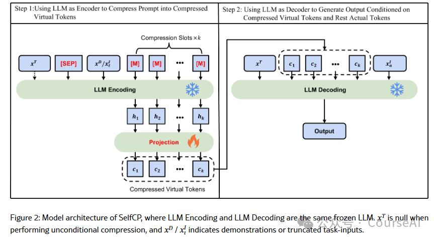 - SelfCP通过使用冻结的大语言模型 (LLM) 作为压缩器和生成器,以及可训练的线性层将隐藏状态投影到LLM可接受的内存token,从而平衡训练成本、推理效率和生成质量,异步压缩超限提示。