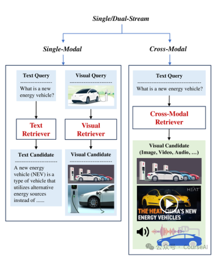 可分为单/双流结构和生成式结构,每种结构都涉及单模态(例如,文本、图像)和跨模态信息检索。