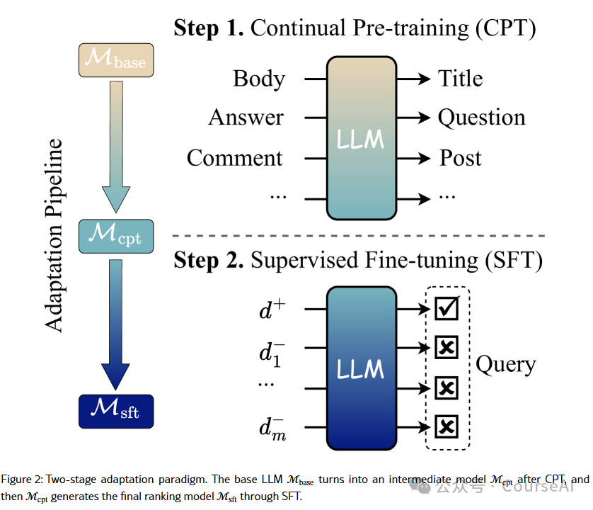 TSARankLLM采用两阶段训练方法:在基于网络的相关的文本对上进行连续预训练以使LLM与排序任务对齐,然后使用监督数据和定制的损失函数进行微调。