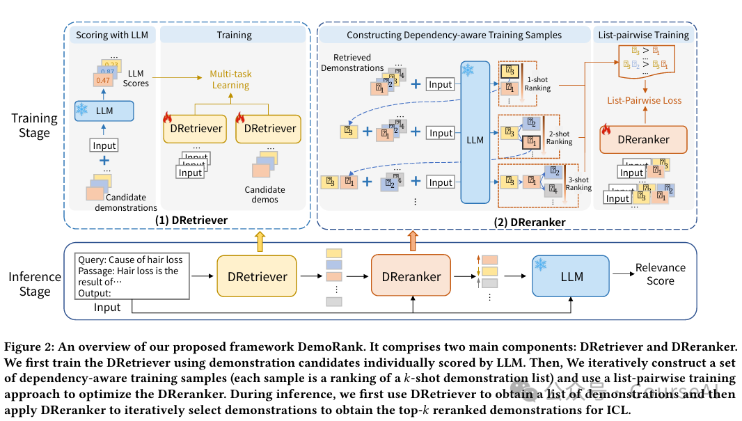 DemoRank通过依赖感知的演示重新排序器来改进演示选择,通过高效的训练样本构建和一种新的列表成对损失来优化排名靠前的示例。