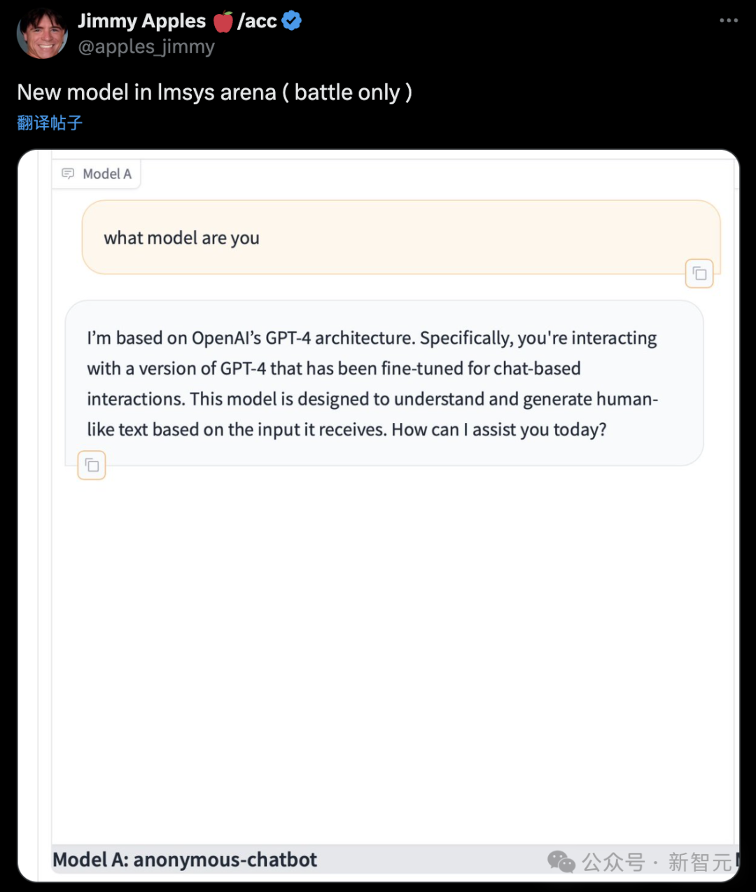 凑巧的是,Jimmy Apples今天还发现了LYSMS竞技场中,闪现一个「匿名」新模型——anonymous-chatbot。