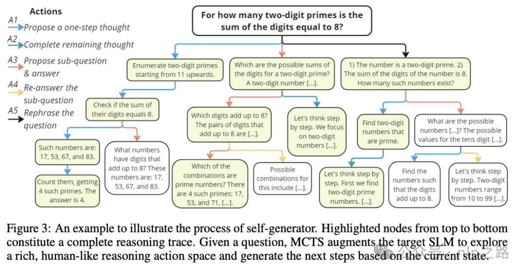 尽管依赖传统的蒙特卡洛树搜索(Monte Carlo Tree Search, MCTS)让SLMs自我生成推理步骤,但rStar提倡在自我探索中使用更丰富的推理动作集。新提出的动作模拟了给定当前推理状态下的人类推理行为,例如分解和搜索特定的推理步骤,提出新的子问题,或重新表述给定问题。这使得SLMs能够在自我探索中生成高质量的候选推理轨迹。