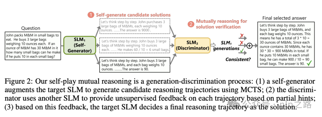 本文介绍了一种名为自博弈相互推理(Self-play muTuAl Reasoning, rStar)的新方法,它在无需微调或高级模型的情况下,在推理期间显著提高了SLMs的推理能力。为了应对前述挑战,rStar将推理分解为自博弈相互生成-判别过程,如图2所示。