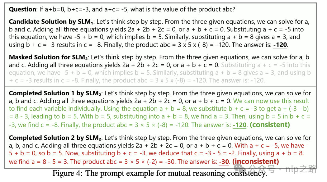判别器SLM2的相互推理一致性:如图2所示,除了目标SLM 1之外,我们引入了另一个SLM 2作为判别器,为每个候选轨迹提供外部无监督反馈。具体来说,对于t = x ⊕ s1 ⊕ s2 ⊕ ... ⊕ sd,我们从随机抽样的步骤i(i < d)开始mask推理步骤。然后,我们提供早期的推理轨迹t = x ⊕ s1 ⊕ s2 ⊕ ... ⊕ si−1作为提示给 SLM2来完成问题的剩余步骤。由于提供了早期i − 1推理步骤作为提示,我们降低了难度,从而增加了SLM2能够提供正确答案的可能性。如下图所示,我们比较SLM2完成的答案是否与原始轨迹t一致。如果它们一致,我们认为t是最终选择的有效轨迹。