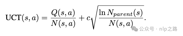 其中N(s, a)是节点s在先前迭代中被访问的次数,Nparent(s)表示s的父节点的访问次数。Q(s, a)是估计的奖励值,将通过反向传播更新。c是一个常数,用于平衡利用和探索。