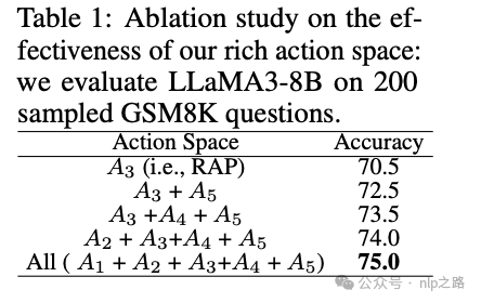 消融实验证明了多样化动作空间,5个动作都用上,效果是最好的。当然上述部分动作之间有先后关系,如A4只能在A3后,A5只能在根节点的问题之后。state是思维树空间的搜索轨迹。