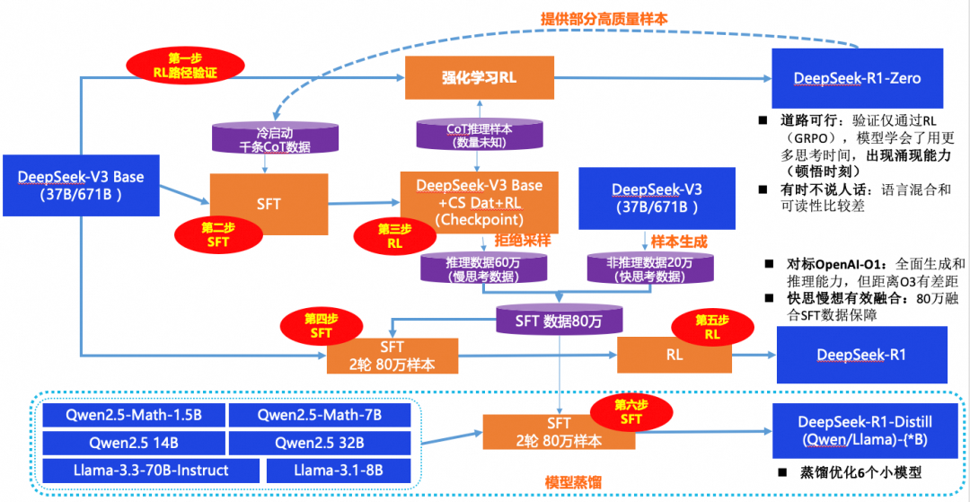 创新1:基于RL(强化学习)实现Time Scaling Law的新范式,对标GPT-o1并开源在此之前,炼丹一个大模型不得不“大力出奇迹”,必须堆算力猛火烹制,必须垒数据老道秘法,但是DeepSeek离经叛道的第一个表现是,他不单纯的迷恋大力,而是开拓了一条新的的路径:通过RL(强化学习),让模型内卷,不停照抄有解题步骤的那种作业(CoT数据),学会检查作业(反思能力),学会延迟交卷( Time Scaling),直到答案还挺高质量的时候再交卷,进而量变引发质变,然后模型就突然顿悟,进化出了“智力”。另外,之前的模式都是按部就班的先SFT,再RHLF,他就绕开了SFT这个传统节目。新开辟的这条路径就是“ Test Time Scaling ”,也有叫“ RL Scaling ”的,是“用时间换效果”的一种路径。这条路径OpenAI一定已经有所发现,且应用在了O1、O3上,但它是个商业化公司,就不告诉你。DeepSeek牛就牛在他验证了这条路的可行性,而且效果上对标O1。创新2:作为“低”训练成本和”高”推理性能的国货之光,成本仅是GPT-o1的1/27第二个离经叛道的表现是因为性价比,因为加量不加价,因为在同样的表现下用了少了很多倍的资源。这个时候我想起了我的授业恩师以及他给我较印象深刻的一个词“集成式创新”。集成式是相对突破式创新而言的,不做技术的从0到1,而是把其他场景的方式和方法,在新的场景进行验证,然后组合式运用,集成式验证,释放出新场景价值,其实DeepSeek也是这个模式,把模型架构、优化方法和基础设施方面相对优势的技术集成式创新。Moe架构改变了FFN全连接的模式,降低了沟通的复杂度,减少了内耗,另外这种架构也可以让模型规模变大,规模代表的是知识规模,懂得更多还沟通和计算的效率更好,MHA是Transform架构的核心,也是吃显存的大户,所以有多改进手段比如GQA,MLA相比之前的MHA、GQA等,他占用的KV Cache大幅度降低。这都是是典型的马儿跑得快,马儿还吃的少。你说这样的牛马,谁不喜欢?主要是GRPO对PPO的进步,中心思想就是简化了结构,不用专用的外部评价模型,把自然进化交给喂给大模型的饲料和强化学习自己评价体系,饲料都是有营养的,配料均衡的,吃得不好他还要自己去思考为啥不好。多Token的预测更简单了,就是三步并作两步走,在别人刚迈出第一步的时候,他已出门了,所以更早的抵达终点。DualPipe流水线的核心思想是不让卡闲着,用更全面和高效的调度把训练过程中前向传播和梯度回传的计算以及内部通讯任务做更加高效的调度,让卡上的每个计算单元,物尽其用。FP8混合精度框架针对加法、乘法等不同场景,结合计算需要,在效果和存储空间中去取得一个比较微妙的平衡。不过这个格式也是在英伟达H系列上的表现更好,国产卡的支持效果上普遍还没跟上。通过这些集成创新的手段,让模型在训练和推理成本上大幅度降低,同时推理的效果又比较良好,这样在成本原先是让大家退而却步的情况得到了极大的改善,不论是捉襟见肘的科技小厂,还是缺卡少钱的甲方,都有了AI盛宴的参与感,也都有奋起直追的勇气,这也可以称之为是通常意义上的AI平权,或者普惠AI。当然,还有一个“离经叛道”的点,非技术原因,那就就是匹夫无罪怀璧其罪,因为DeepSeek是中国人的知识成果,还是一群没有喝过洋墨水的人做出来的,所以给DeepSeek增加了更多的民族色彩。0x03:DeepSeek-R1模型训练及蒸馏技术链路