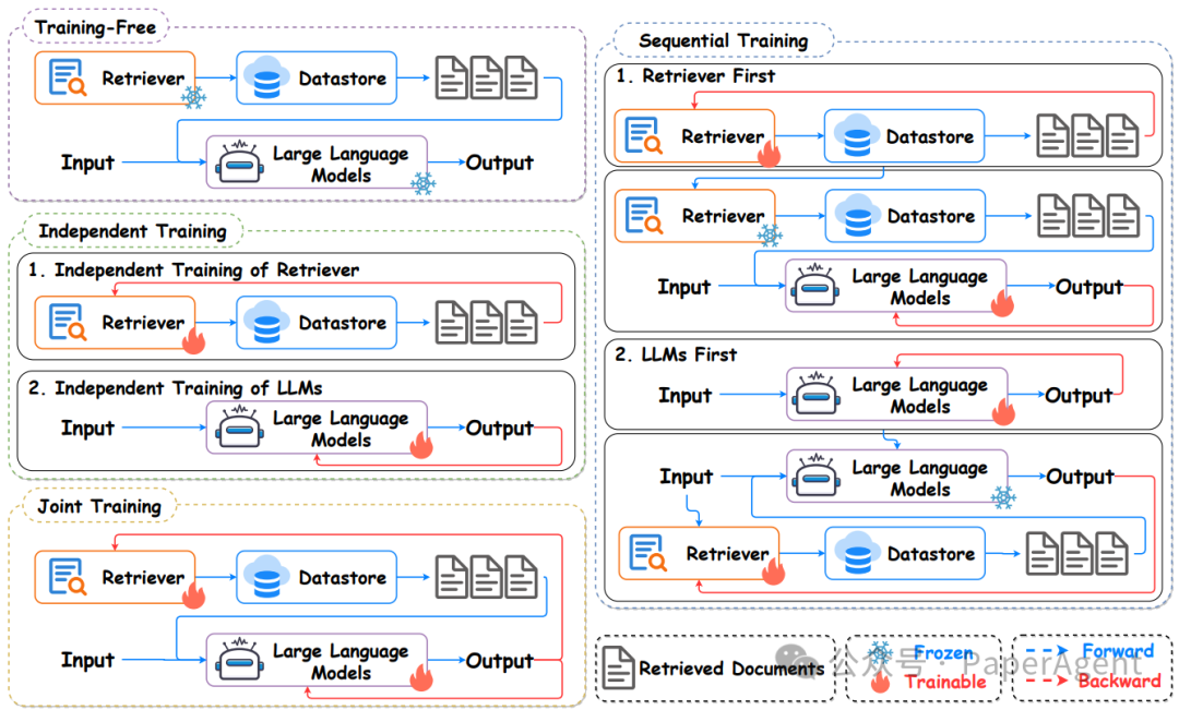 - 独立训练:在独立训练方法中,检索器和LLMs作为两个完全独立的过程进行训练,两者在训练过程中没有交互。