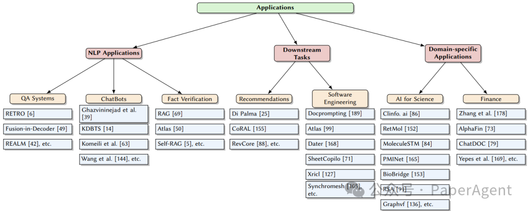 RA-LLMs应用按自然语言处理(NLP)应用、下游任务和特定领域应用分类的。具体来说,NLP应用包括问答系统、聊天机器人和事实验证;下游任务包括推荐和软件工程;特定领域应用包括科学和金融领域的AI应用。图5:检索增强型大型语言模型(RA-LLMs)应用分类