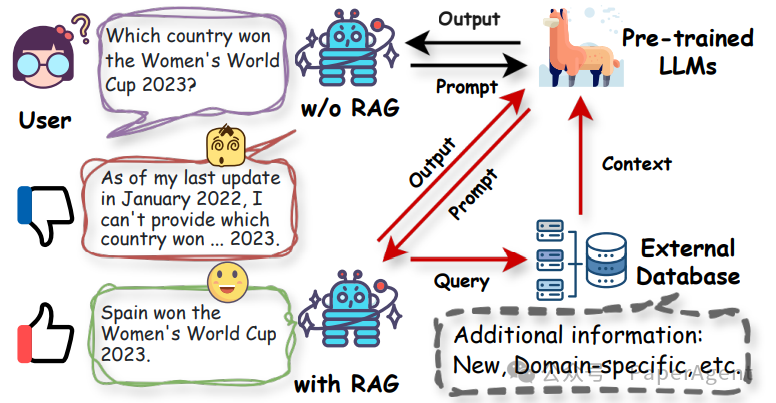 检索增强型生成(RAG)能够为像大型语言模型(LLMs)这样的生成型 AI 模型提供可靠和最新的外部知识,增强其能力。LLMs 已经展示了革命性的语言理解和生成能力,但仍然面临着幻觉和过时的内部知识等局限性。检索增强型大型语言模型(RA-LLMs)利用外部知识来解决 LLMs 的局限性,减少仅依赖内部知识的情况。图1:检索增强型生成(RAG)遇见大型语言模型(LLMs)。当用户的查询超出范围时,例如,在训练数据中未见过的内容或需要最新信息来回答时,LLMs 可能会显示出较差的生成性能。在RAG的帮助下,LLMs 可以利用来自外部数据源的额外相关信息来增强文本生成能力。