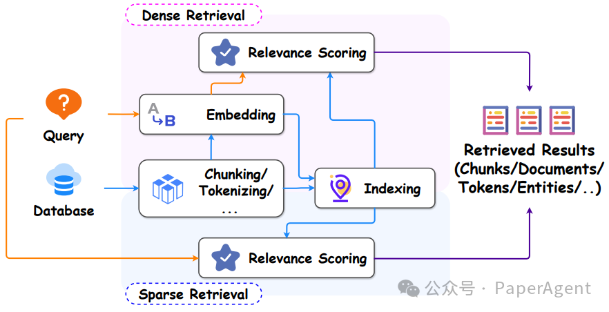 - 检索器类型(Retriever Type):检索方法分为稀疏(sparse)和密集(dense)两种,基于信息编码方法的不同。稀疏检索通常基于词汇,而密集检索将查询和文档嵌入到向量空间中。
