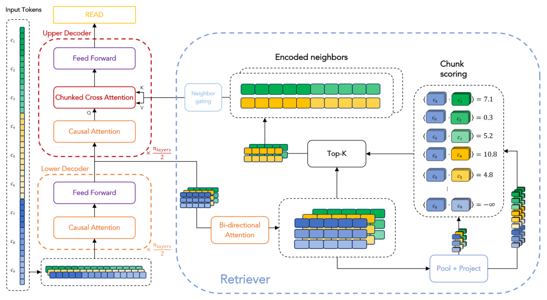 虽然通过检索增强处理长文本的方法和检索增强生成(Retrieval Augmented Generation,RAG)均用到了检索,但二者之间还是存在着一定的区别。首先,二者在检索对象上存在区别。长文本检索增强方法是在上下文历史的表示中检索,而RAG则侧重于在广泛的外部知识库中检索。其次,这两类方法在检索的实现上也有所不同。如前面介绍的内容,长文本检索增强方法直接利用K-V Cache中的key计算相似度,作为检索的标准。并将检索到的(key,value)对直接用于模型后续attention的计算。相比之下,RAG面对庞大的外部知识库,利用一个独立的检索器(retriever)完成检索。此外,RAG可能还需要额外的组件来确保检索到的内容与生成的文本之间的一致性。由于这种结构上的复杂性,RAG通常不适用于直接处理长文本。通过上述分析,我们可以看出,虽然两种方法都涉及检索过程,但它们在检索对象和检索实现上有着不同,各有其适用的场景和限制。那么,可以考虑采用 RAG 的方法来处理长文本吗?答案是肯定的。RPT[15]架构正是借鉴了RAG的检索思路来处理长文本。如图3所示,其整体流程与前文介绍相似,但每个步骤涉及的对象和处理方式有所区别,下面进行简要介绍。RPT采用encoder-decoder架构,在decoder阶段进行检索。它参照了RAG的实现,并配备了一个可训练的检索器。不同于RAG,RPT仅从encoder的输出中进行检索,而不涉及外部知识。具体来说,输入首先通过encoder处理,得到最后一层的隐层表示,这些表示被存储下来,构成检索库。在decode阶段进行Cross Attention计算时,会借助一个额外的检索器在这个检索库中检索。检索器首先将encoder的输出与decoder的输入通过一个双向attention层进行对齐,然后计算这两者对齐后的表示的内积作为相似度评分,最后选择top-k的表示作为检索结果。值得注意的是,此处的检索是在 block-to-block 级别进行,与之前的token-to-token和token-to-block不同。检索完成后,所得的表示还需通过一个邻接门控(neighbor gating)机制,参与到最终的Cross Attention的计算中。这里的Cross Attention采用了 RAG 中的一种变体—Chunked Cross Attention[16],这种形式能够有效学习到上下文的连贯性,从而更准确地预测下文。
