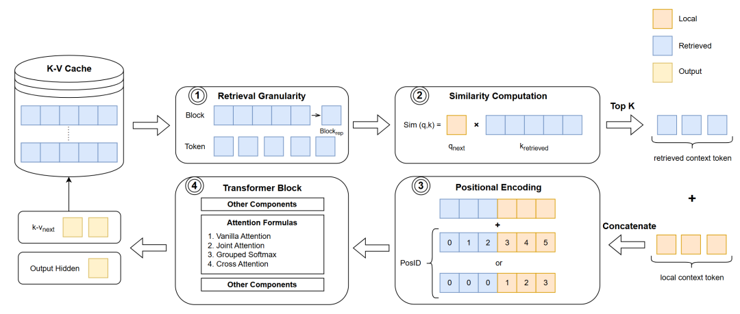受预训练的限制,模型能够较好处理的序列长度相对固定,通常为2048、4096等等。在不改变attention计算机制的前提下,很难保证在模型能力损失较小的同时,显著扩展模型能够处理的上下文长度。并且,在长文本上训练的代价也很高,直接在长文本上从头训练一个窗口长度很长的模型较为困难。于是,我们希望模型能够在有限的处理窗口中能够关注长上下文中关键的token,获取其中的信息,从而充分利用长文本中的知识,提升处理长文本的能力。 众多研究者提出了基于检索增强的方法,通过在上下文历史中查找关键token,并将它们放入attention计算中的方式,增强模型在长文本任务上的表现。其大致流程如图1所示,基本思路是分段处理,通过多次调用短上下文模型来处理长上下文输入,在此过程中保存K-V Cache供后续分段使用。引入检索增强技术之后,模型的处理流程如下。首先,模型以不同的检索粒度从K-V Cache中取出相应的 token 表示。然后,模型计算当前处理的token与这些历史token的相似度,并根据相似度结果选取最相关的top-k token。检索到的token会与当前窗口内的上下文拼接在一起,组合成新的上下文,用于当前的输入。随后,进行合适的位置编码。最后,把输入序列送入模型层,得到当前层的输出,其中最关键的是attention部分。下文将按上述处理顺序,对应图1中的四个关键步骤依次介绍。