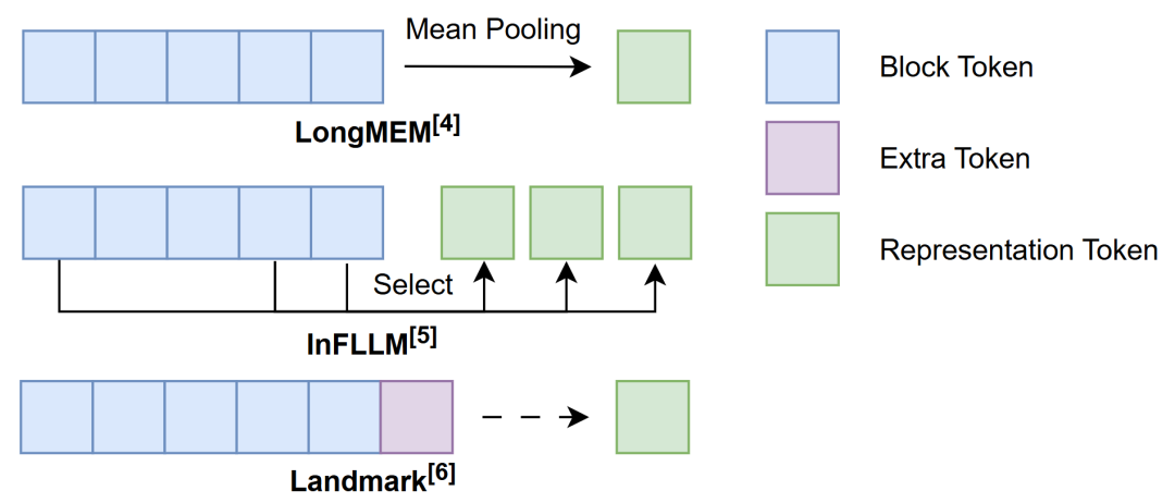 | 块表示 | —— | Mean pooling | Landmark token | —— | Representative tokens | —— |