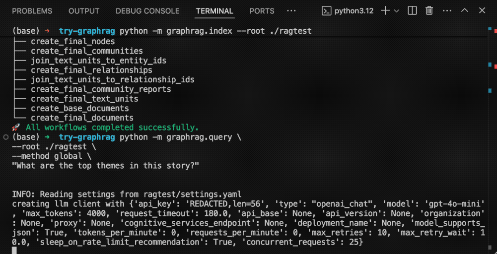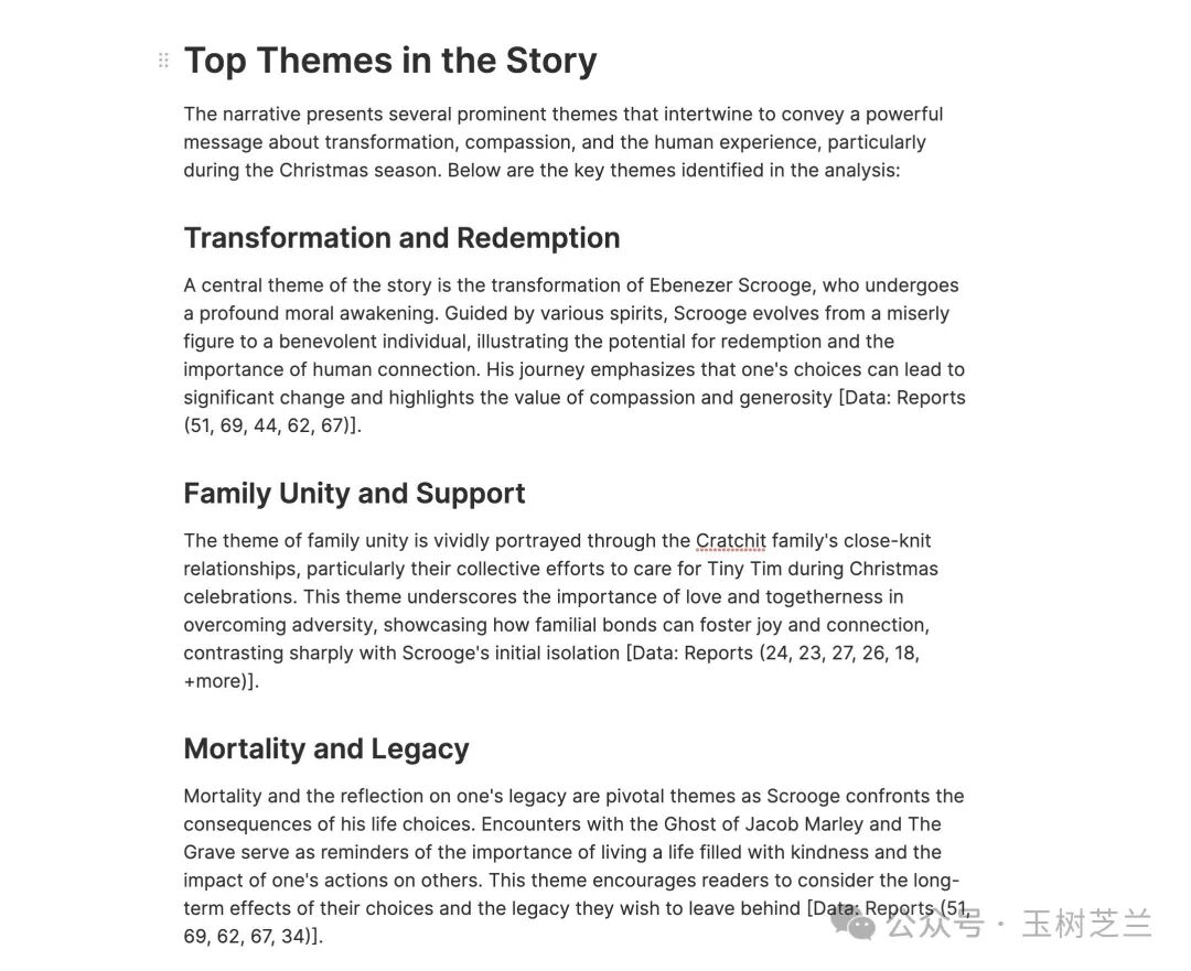 python -m graphrag.query \ --root ./ragtest \ --method global \ "What are the top themes in this story?"注意这里的命令,Global(全局)代表我对整本书提问。我们问的问题是:这个故事有哪些最主要的主题?
