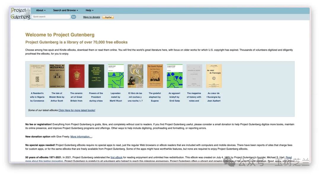 接下来,我们要把书籍资料下载下来。这里 GraphRAG 官网样例使用的是古腾堡计划,上面有很多免费的图书。古腾堡计划是一个致力于创建和分发免费电子书的志愿者项目,它提供了大量版权已过期的经典文学作品。