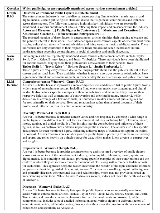 为了测试这种方法,使用了包括播客转录和新闻文章在内的多样化真实世界数据集,以了解它如何处理关于广泛主题和问题的问题。此外,GraphRAG 方法与传统 RAG 方法比较后,你会发现 GraphRAG 方法在成本更低的情况下提供了更全面和多样化的答案,特别是当使用来自社区层次结构中层级较低的摘要时。简单介绍一下 GraphRAG
