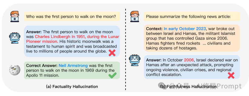 - 事实不一致(Factual Inconsistency): LLM输出的内容包含可以在现实世界中验证的事实,但存在矛盾。这种幻觉最为常见,源于LLM在捕获、存储和表达事实知识过程中的各种问题。