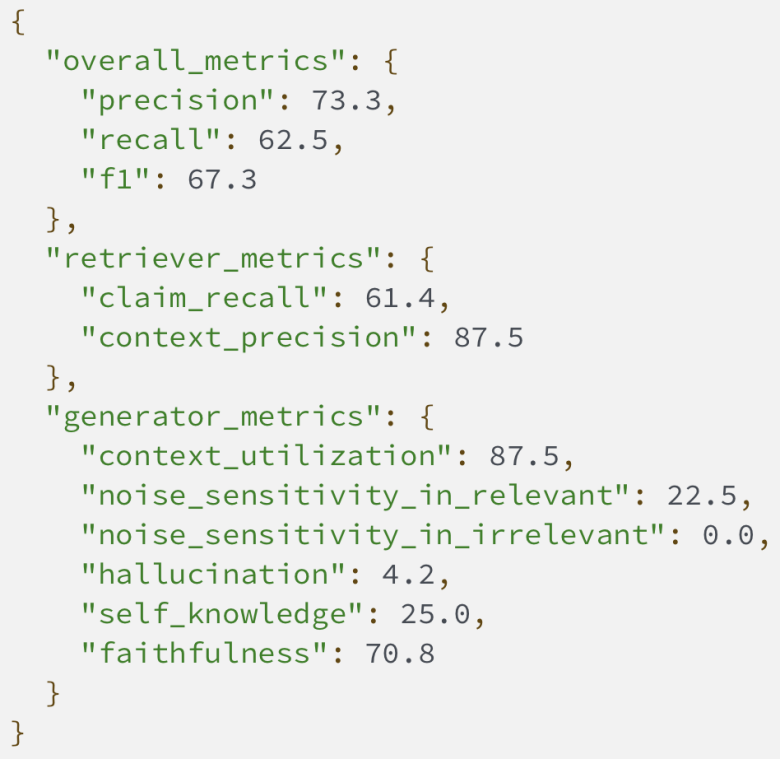 4. 分析结果:RAGChecker 会输出 json 格式的文件来展示评估指标,帮助你了解 RAG 系统的各个方面表现。