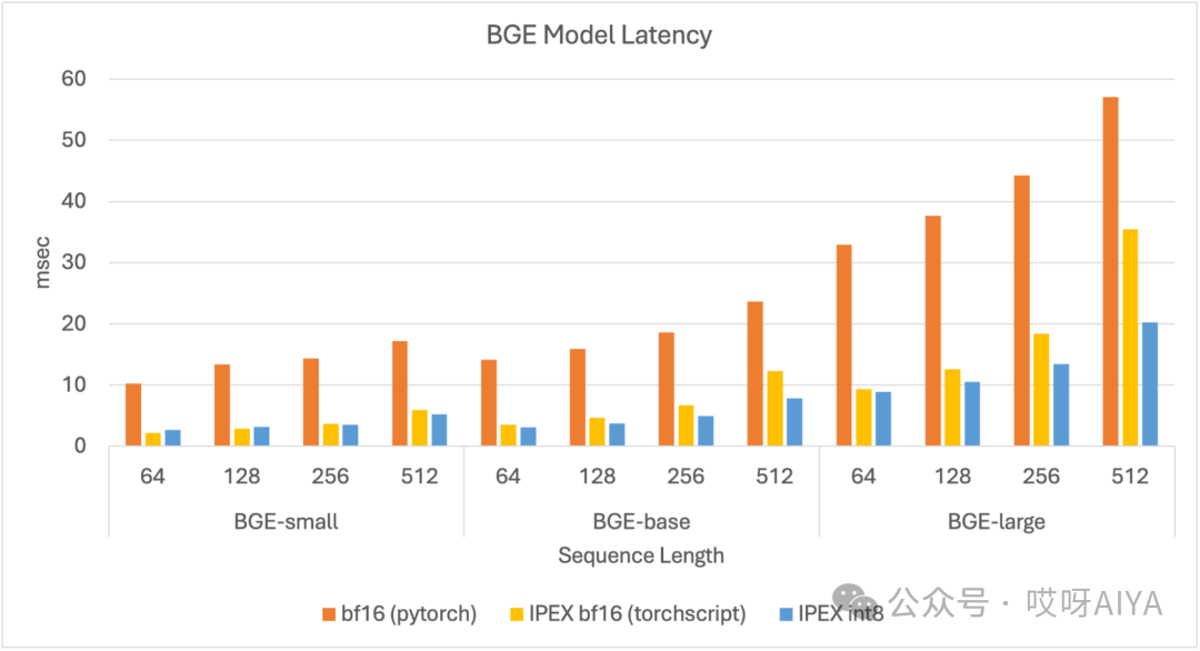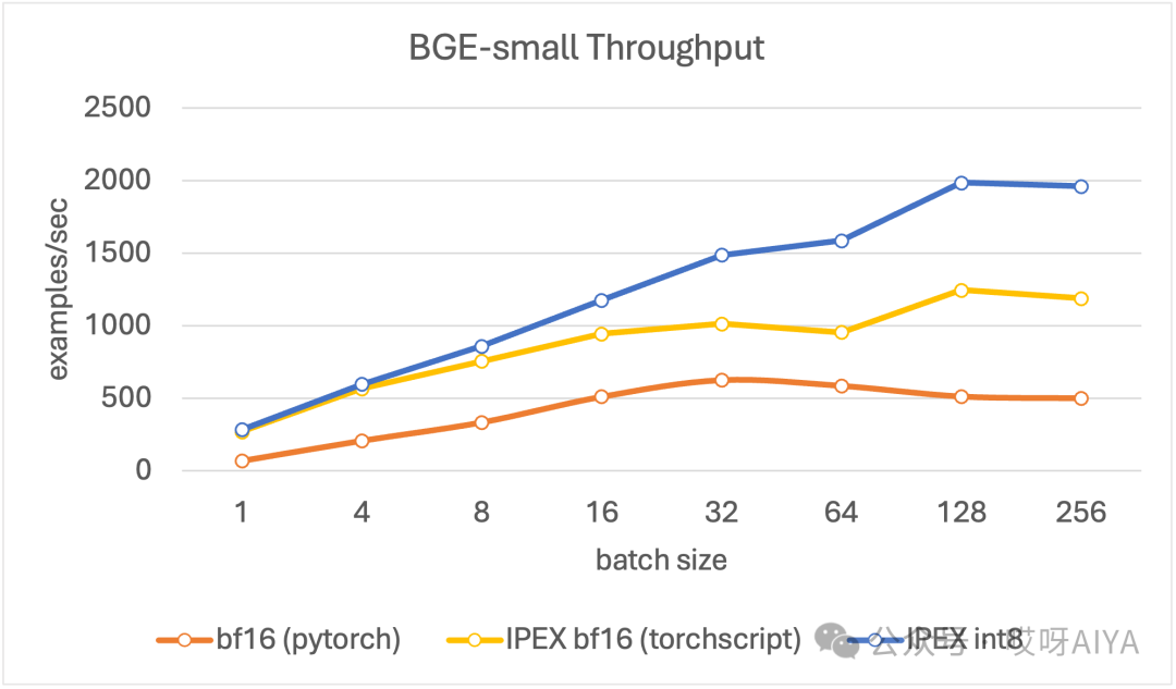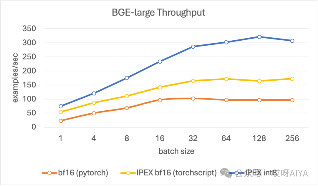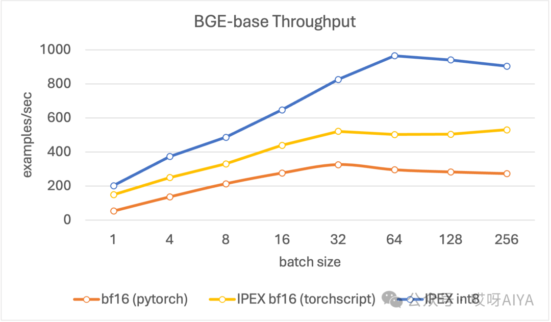 上篇我们介绍了,在RAG系统中向量模型使用的情况,本篇文章我们来介绍如何提升向量模型的吞吐量。下图是优化后的bge模型的吞吐量对比:使用 Optimum Intel 和 IPEX 优化嵌入模型Optimum Intel 是一个开源库,其针对英特尔硬件对使用 Hugging Face 库构建的端到端流水线进行加速和优化。Optimum Intel 实现了多种模型加速技术,如低比特量化、模型权重修剪、蒸馏以及运行时优化。Optimum Intel 在优化时充分利用了英特尔® 先进矢量扩展 512 (英特尔® AVX-512) 、矢量神经网络指令 (Vector Neural Network Instructions,VNNI) 以及英特尔® 高级矩阵扩展 (英特尔® AMX) 等特性以加速模型的运行。具体来说,每个 CPU 核中都内置了 BFloat16 ( bf16 ) 和 int8 GEMM 加速器,以加速深度学习训练和推理工作负载。除了针对各种常见运算的优化之外,PyTorch 2.0 和 Intel Extension for PyTorch (IPEX) 中还充分利用了 AMX 以加速推理。使用 Optimum Intel 可以轻松优化预训练模型的推理任务。本文将介绍广为人知的 MTEB 排行榜上取得了亮眼的排名的 BGE 嵌入模型。双编码器模型基于 Transformer 编码器架构,其训练目标是最大化两个语义相似的文本的嵌入向量之间的相似度,常见的指标是余弦相似度。举个常见的例子,我们可以使用 BERT 模型作为基础预训练模型,并对其进行微调以生成嵌入模型从而为文档生成嵌入向量。有多种方法可用于根据模型输出构造出文本的嵌入向量,例如,可以直接取 [CLS] 词元的嵌入向量,也可以对所有输入token的嵌入向量取平均值。双编码器模型是个相对比较简单的嵌入编码架构,其仅针对单个文档上下文进行编码,因此它们无法对诸如 查询 - 文档 及 文档 - 文档 这样的交叉上下文进行编码。然而,最先进的双编码器嵌入模型已能表现出相当有竞争力的性能,再加上因其架构简单带来的极快的速度,因此该架构的模型成为了目前的标配。这里,我们主要关注 3 个 BGE 模型: small、base 以及 large,它们的参数量分别为 45M、110M 以及 355M,嵌入向量维度分别为 384、768 以及 1024。请注意,下文展示的优化过程是通用的,你可以将它们应用于任何其他嵌入模型 (包括双编码器模型、交叉编码器模型等)。下面,我们展示如何提高嵌入模型在 CPU 上的性能,我们的优化重点是降低延迟 (batch size 为 1) 以及提高吞吐量 (以每秒编码的文档数来衡量)。我们用 optimum-intel 和 INC (Intel Neural Compressor) 对模型进行量化,并用 IPEX 来优化模型在 Intel 的硬件上的运行时间。请运行以下命令安装 optimum-intel 和 intel-extension-for-transformers :pip install -U optimum[neural-compressor] intel-extension-for-transformers
