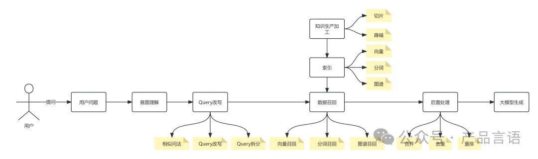 RAG整理业务链路划分为5个步骤:知识生产加工、query改写、数据召回、后置处理以及大模型生产;