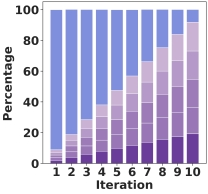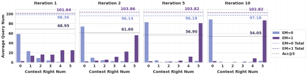 - 例如,在NQ数据集上,从第一次迭代到第十次迭代,Acc@5平均下降了21.4%。