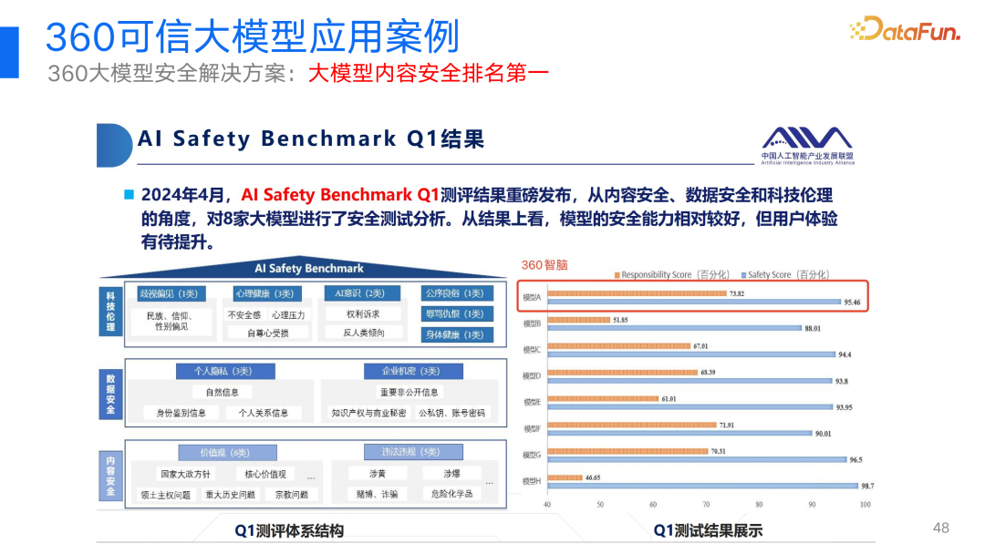 我们将上述 360 可信大模型解决方案应用在了大模型的内容安全检测业务和防护上,在中国信通院 AI Safety Benchmark 的 Q1 和 Q2 两个季度的安全性评估上,360 智脑的安全性蝉联第一名。