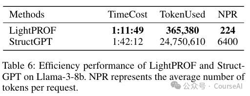 - LightPROF 的平均每个请求的标记数(NPR)为 224,远低于 StructGPT 的 6400,表明 LightPROF 在处理每个请求时更精确、更高效。