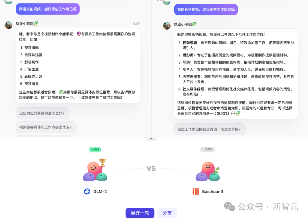 过程与前面基本相同,唯一的区别是用户不需要指定模型,系统会随机分配模型供你对战使用。这对普通用户来说非常有价值,他不仅可以比较模型的能力,还可以感受扣子上许多有趣Bot的能力。