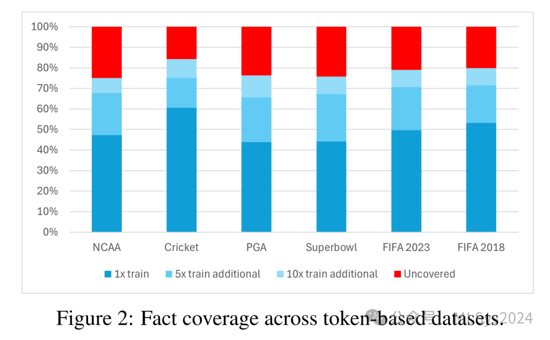 此外,尽管我们生成训练和评估数据集的方法是一致的,但可能并未完全涵盖现实应用中遇到的语言使用的多样性。我们的训练和评估数据集是根据相同程序生成的,并来自同一分布。未来的研究可以受益于开发更能准确反映人类查询多面性特征的数据集,涵盖各种语言风格和结构。最后,由于事实密度和令牌计数的可变性,使用令牌扩展与事实扩展数据集训练的模型之间的直接比较存在一定复杂性。令牌扩展没有固定的事实覆盖率,因为GPT-4的Q&A分布存在偏差;而事实扩展没有固定的令牌计数,因为每篇文档中的事实数量可能不同,并且我们需要足够的令牌预算来覆盖所有事实。因此,我们观察到事实扩展数据集的令牌计数大于令牌扩展数据集的等价物,例如1倍事实训练集的令牌数大约是1倍令牌训练集的两倍。尽管如此,我们仍然支持基于事实的方法,因为前面讨论过的覆盖范围保证。表1列出了每个基于事实的训练数据集的令牌乘数。为了解决这个问题,未来的工作可以致力于标准化一个维度——无论是令牌还是事实——以便于更清晰地进行比较,并就每种方法的相对优势得出更明确的结论。