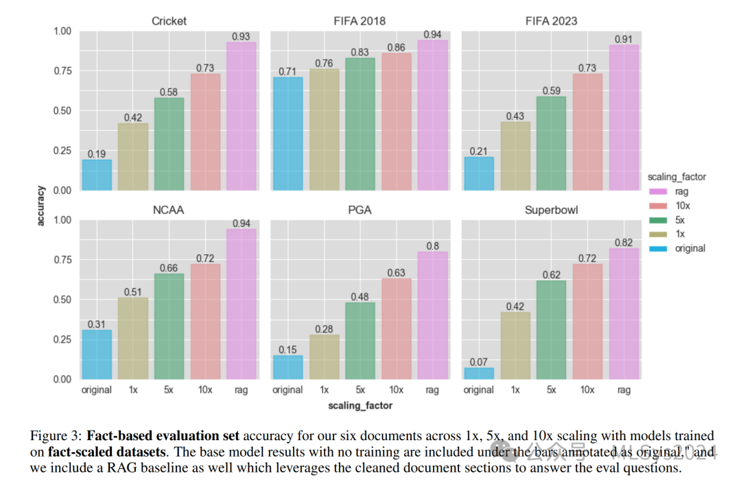 本研究在探讨SFT和知识注入时,采用了相同类型的数据集——关于体育赛事的维基百科文章。未来的研究可以通过纳入来自不同领域的多样化文本语料库来增强我们发现的稳健性。这不仅能验证我们方法的普适性,还能提高模型在更广泛知识领域中的适应性。在评估知识保留的有效性时,我们主要关注了体育相关内容中答案的正确性。然而,重要的是要考虑模型在更广泛主题上的表现,特别是在可能跨越多个领域的现实对话场景中。未来的研究应探讨新知识获取的权衡,尤其是对新知识的获取可能对模型在先前学习概念上的熟练度产生的潜在影响。我们对超参数调整和欠拟合可能性的初步探索取得了令人鼓舞的结果,观察到在增加训练轮次后,性能有了显著提升。我们尝试将轮次从3加倍到6,并再次在事实数据集上进行训练,结果如图5所示。在一些情况下,如PGA在10倍数据集时,或在NCAA在1倍数据集时,我们的评估集得分显著提高了高达10%或15%的绝对值。那么,我们所看到的扩展增益是否仅仅是因为更大的数据集等同于更长的训练时间,从而产生与延长训练轮次相同的效果?为此,我们比较了5倍数据集6轮次的结果与10倍数据集3轮次的结果,它们在训练成本上大致相等,但在扩展上有所不同。在所有六个数据集中,10倍数据集3轮次的配置均优于5倍数据集6轮次的配置,尽管在某些数据集中这一优势仅为3-5%。因此,我们的一些增益可能仅仅归因于更长的训练时间,但一致的超常表现让我们相信,通过不同问题进行的扩展也有其益处。尽管如此,数据集扩展、训练时长和学习效率之间的关系仍值得进一步探索。未来的研究应旨在明确数据集扩展与延长训练周期的具体贡献,同时考虑增加轮次可能带来的过拟合风险。