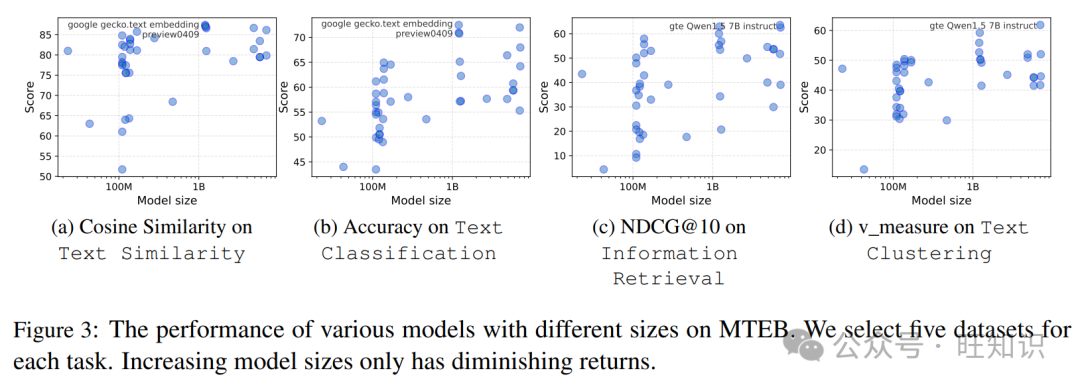 此外,并非所有任务都需要大型模型;一些不涉及知识密集和不要求复杂推理的任务可以由小型模型有效处理。例如,图3c展示了MTEB(Muennighoff et al., 2023)中四项任务的性能与模型规模之间的关系,我们观察到随着模型规模的增加,性能收益递减,特别是在文本相似性和分类等任务中。在信息检索(图3c)的情况下,它涉及计算查询和文档集合之间的相似性,快速推理速度至关重要。在这些条件下,轻量级Sentence-BERT(Reimers and Gurevych, 2019)仍然在IR任务中广泛使用。