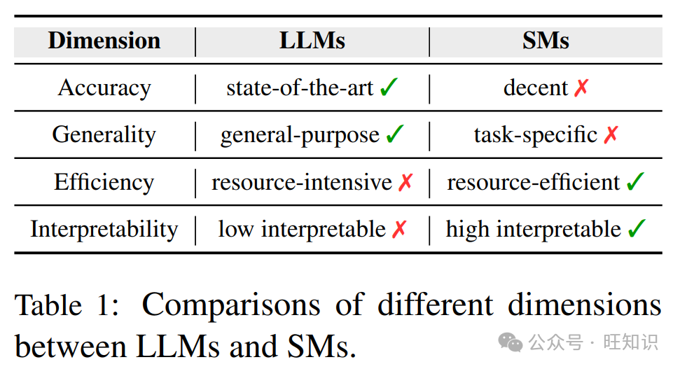 为了评估SMs的角色,有必要比较它们与LLMs的优势和劣势。表1突出了四个关键维度: