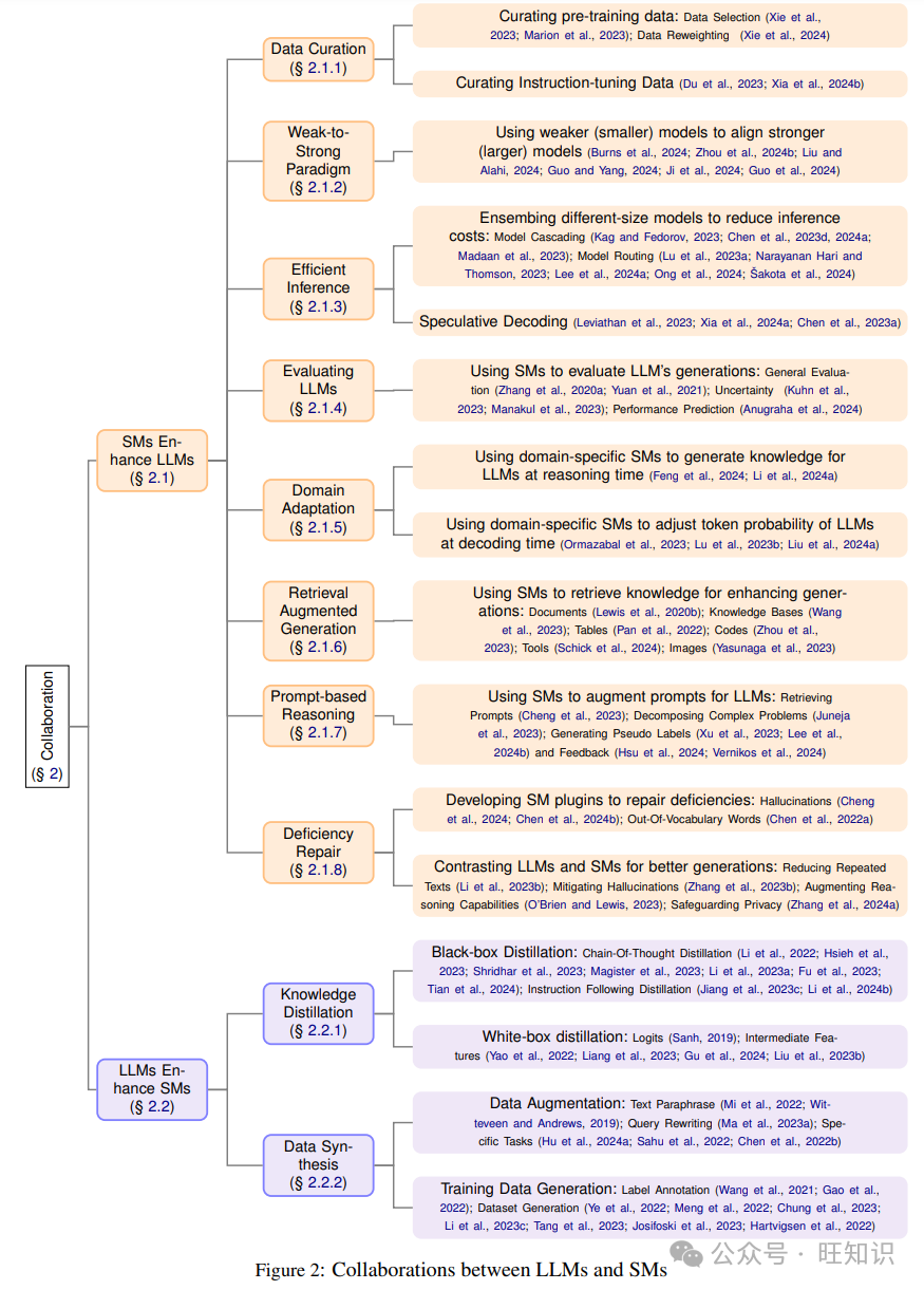 在下文中,我们将展示SMs和LLMs如何合作以优化资源使用:SMs增强LLMs(§ 2.1)和LLMs增强SMs(§ 2.2)。整体合作框架列在图2中。