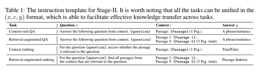 作者将上述五部分的数据和任务成统一为标准化的问答格式 (x, c, y),其中 x 是问题,c 是上下文,y 是目标答案。表1展示了如何将不同任务转换为统一格式。这带来了以下好处:- 通过增加相对较少的排序数据,增强了LLM的排序能力。